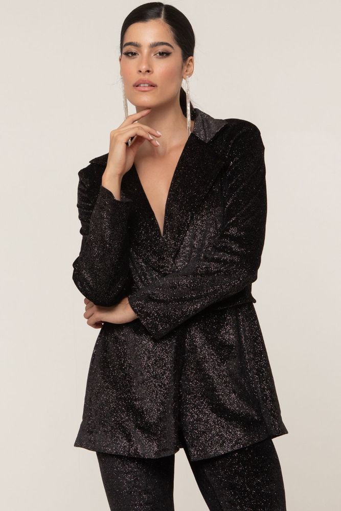 O blazer com acabamento em glitter é uma peça elegante e sofisticada que certamente chama a atenção. Ele apresenta detalhes brilhantes em toda a sua superfície, conferindo um toque de glamour ao visual. Este blazer possui um corte clássico com bolsos laterais funcionais, proporcionando praticidade e um lugar conveniente para guardar pequenos itens. Sua gola em formato V adiciona um elemento de estilo e destaque ao decote. Quanto à composição do tecido, o blazer é feito principalmente de poliéster, com uma mistura de 96% poliéster e 4% elastano. Essa combinação oferece uma excelente durabilidade, resistência e elasticidade, permitindo que a peça se ajuste confortavelmente ao corpo. Para garantir um acabamento interno suave e confortável, o blazer é revestido com 100% poliéster no forro. O forro não apenas proporciona uma sensação agradável ao vestir, mas também ajuda a manter a estrutura do blazer e melhora sua aparência externa. Nossas peças acompanham as linhas do corpo com fluidez, leveza e conforto, abraçando todos os estilos valorizando a mulher. Aposte no Blazer SMK para se sentir inKrível em qualquer ocasião todos os dias.