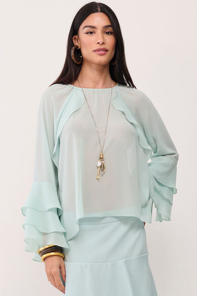 Blusa leve e sofisticada, confeccionada em tecido fluido com transparência sutil que traz charme e elegância ao visual. O modelo apresenta caimento soltinho, gola arredondada delicada e recortes frontais que adicionam movimento. As mangas longas são o grande destaque, finalizadas com babados em camadas que criam um efeito romântico e moderno ao mesmo tempo. Uma peça versátil e elegante, perfeita para compor looks refinados com conforto e estilo.