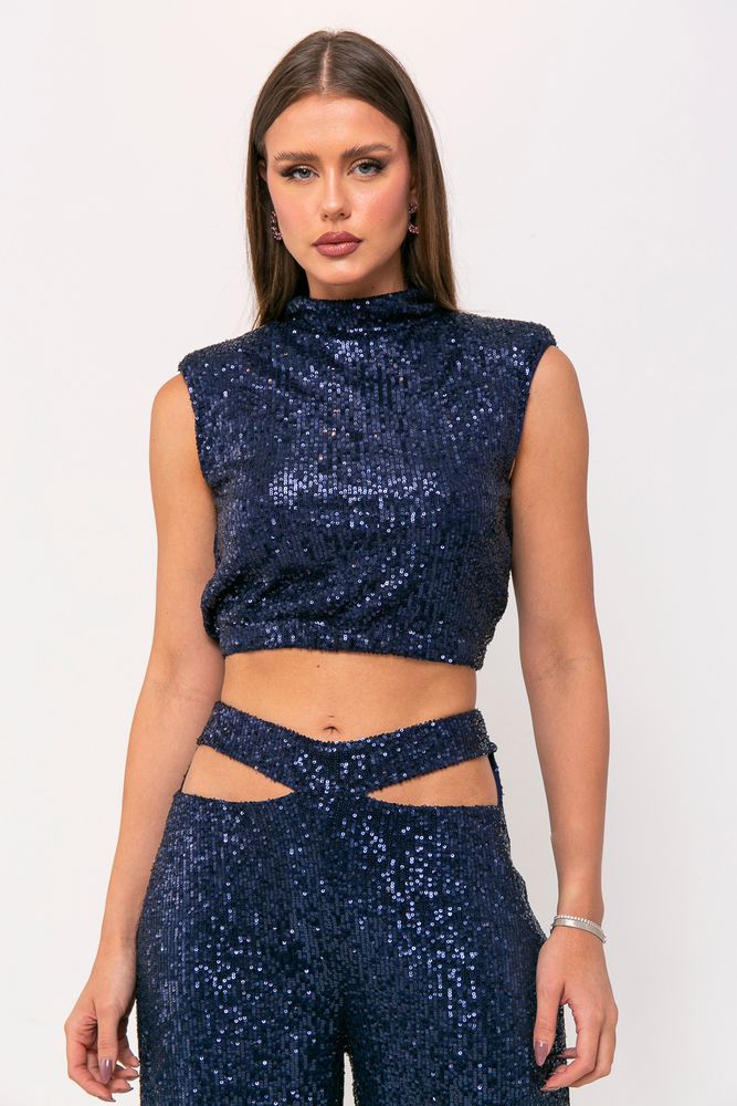 Blusa Feminina Paetê Mari Gola Alta Smk Azul Médio