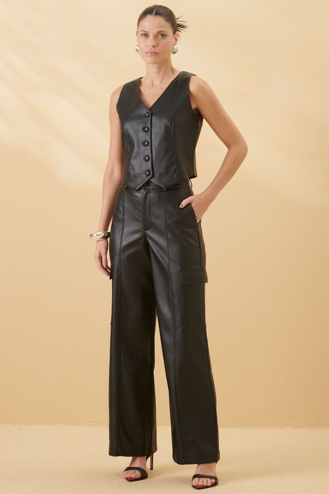 Com design moderno, a Calça Cargo em couro sintético traz personalidade ao visual.
