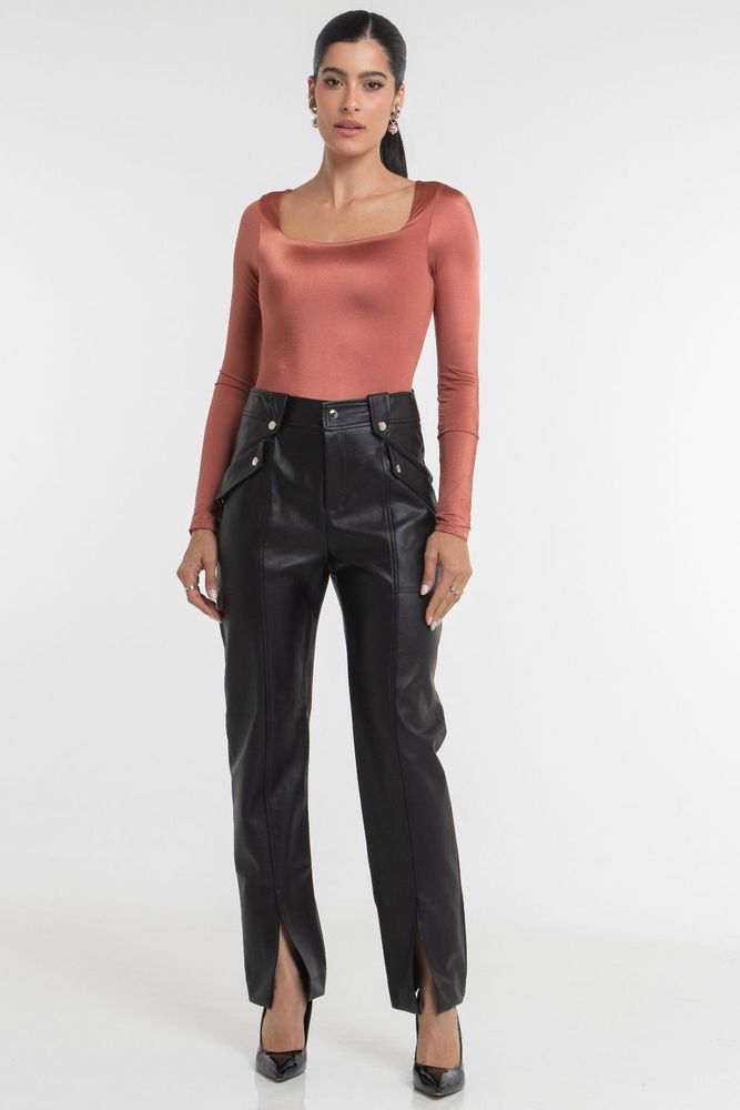 A Calça Reta Couro aposta em um visual moderno e cheio de atitude.