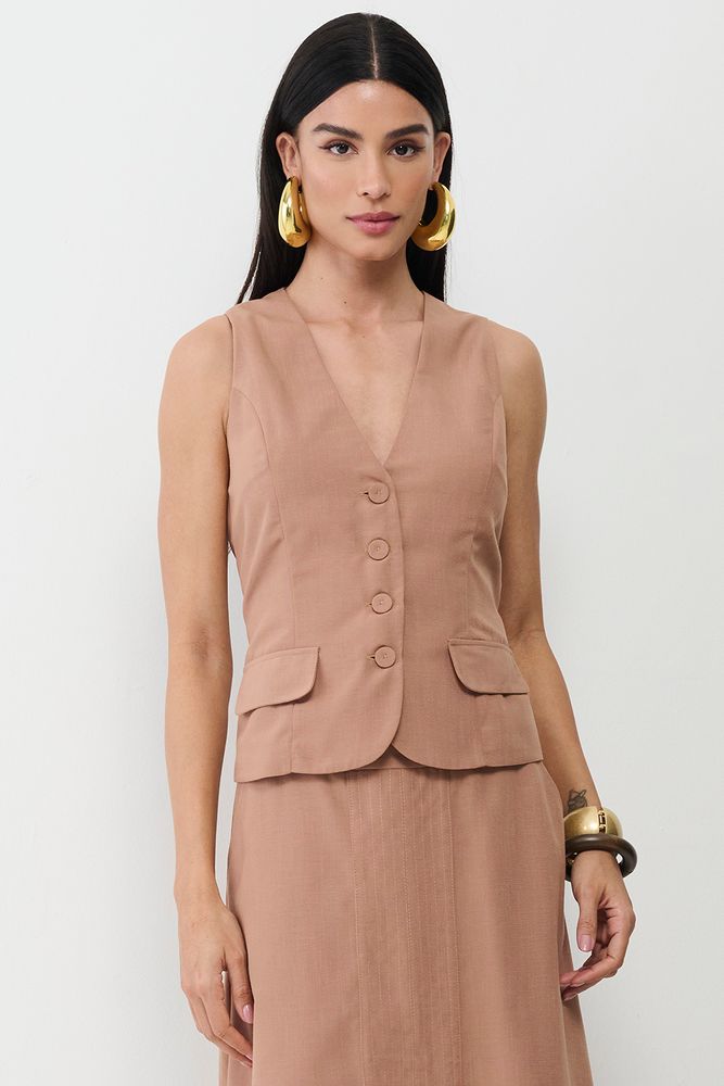 Este colete feminino em tom claro tem um visual clean e elegante. Ele vem sem mangas, com decote em V mais profundo e fechamento frontal por quatro botões forrados no mesmo tecido. A peça tem modelagem reta e acabamento estruturado, além de dois bolsos frontais com aba que reforçam o estilo clássico. É uma peça leve, versátil e fácil de combinar, ideal para looks de trabalho ou composições mais casuais.