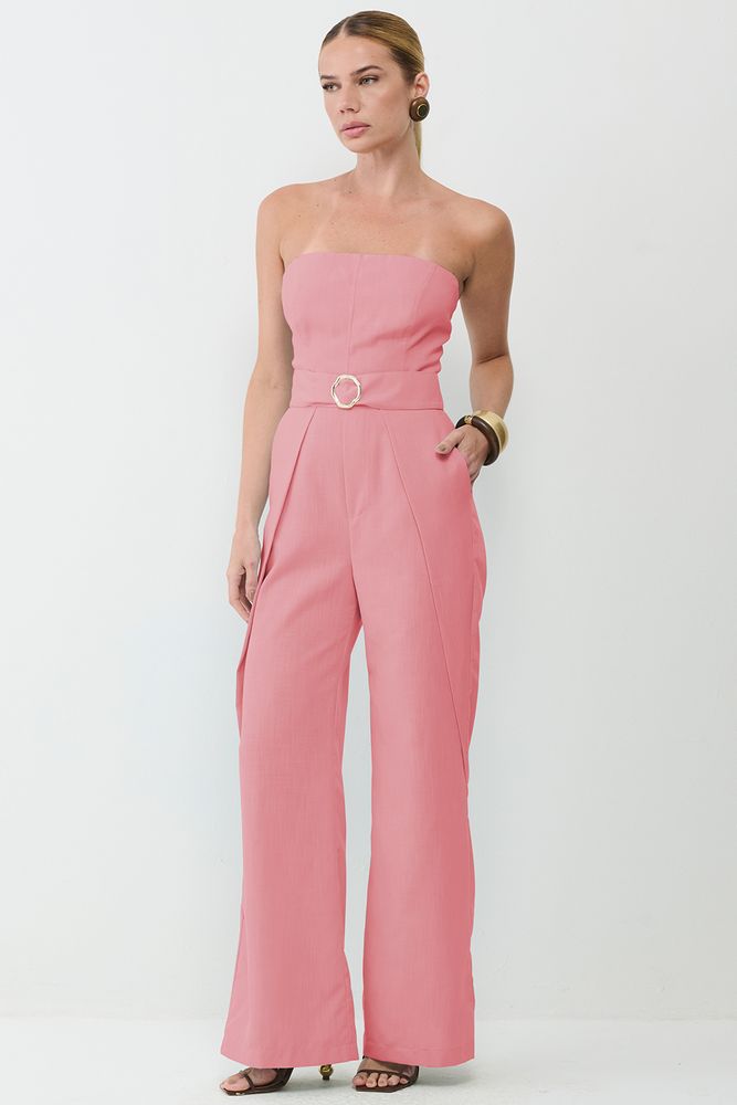 Este macacão combina elegância contemporânea com um frescor tropical, sendo a escolha perfeita para eventos diurnos sofisticados ou ocasiões especiais. A modelagem transmite leveza, enquanto o corte estruturado garante uma silhueta impecável.