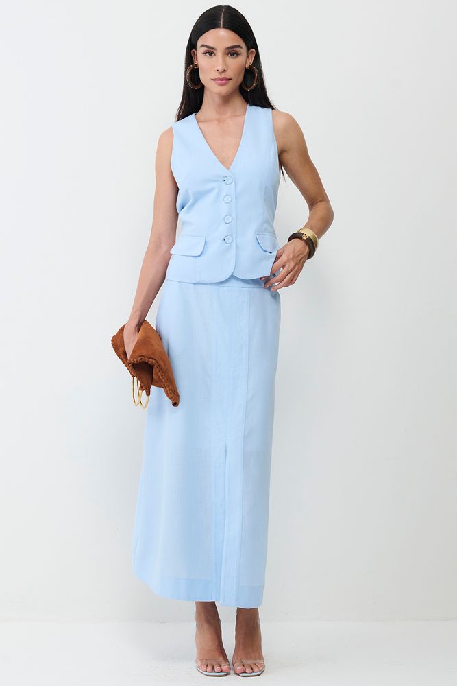 Esta saia longa tem um visual sofisticado e minimalista. O modelo apresenta cintura alta, corte reto e fenda frontal que adiciona leveza e movimento ao caminhar. Confeccionada em tecido leve com bom caimento, garante conforto e elegância em qualquer ocasião. Possui bolsos laterais funcionais e acabamento refinado, ideal para combinações modernas com coletes, camisas ou blusas leves.