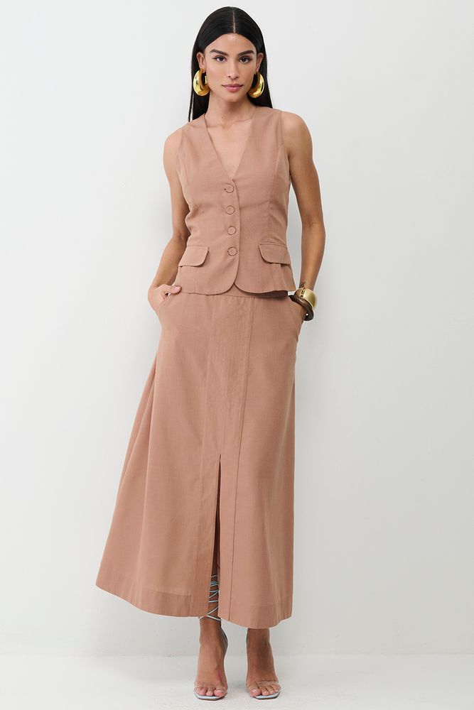 Esta saia longa tem um visual sofisticado e minimalista. O modelo apresenta cintura alta, corte reto e fenda frontal que adiciona leveza e movimento ao caminhar. Confeccionada em tecido leve com bom caimento, garante conforto e elegância em qualquer ocasião. Possui bolsos laterais funcionais e acabamento refinado, ideal para combinações modernas com coletes, camisas ou blusas leves.