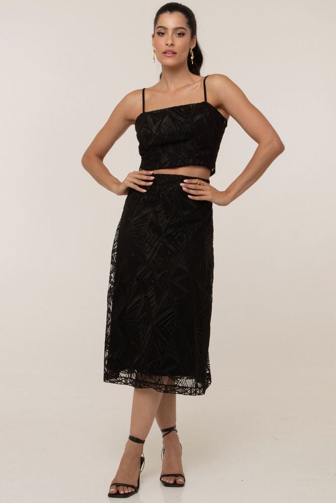Saia Midi Renda Bordado Geométrico Smk Preto