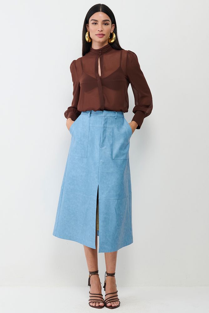 A Saia Midi Reta com Fenda SMK, parte da coleção Elaine Mickely, combina elegância e personalidade em couro PU premium, oferecendo textura refinada e caimento impecável. Seu design minimalista destaca bolsos frontais amplos e uma fenda frontal que acrescenta movimento e sensualidade na medida certa. Com fechamento por zíper e fecho e costura reforçada, entrega praticidade, durabilidade e um estilo contemporâneo de alto padrão.