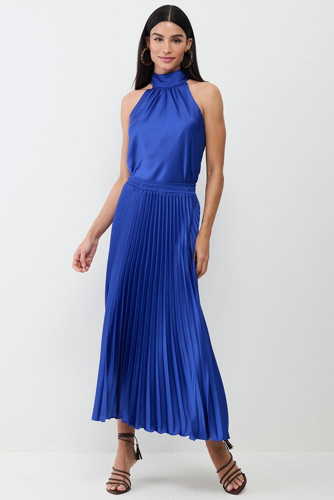 Adicione um toque de sofisticação e movimento ao seu guarda-roupa com esta Saia Midi Plissada, uma peça elegante e vibrante. Seus plissados verticais criam um efeito fluido e dinâmico, enquanto o comprimento midi clássico garante um visual refinado para qualquer ocasião, do casual chic ao formal. O design conta com cós de elástico para máximo conforto e ajuste prático, e um tecido com brilho acetinado sutil que eleva instantaneamente o seu look. Esta saia é sinônimo de versatilidade, combinando perfeitamente com tops variados.
