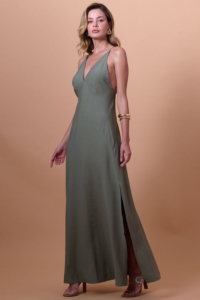 Vestido Longo Alça Fina SMK com Decote V e Fenda Lateral