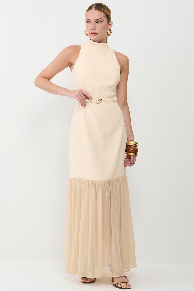 O modelo apresenta gola alta que confere um visual moderno e refinado, além de uma modelagem reta que valoriza a silhueta com sutileza. Na região da barra, o vestido ganha destaque com o tecido leve e translúcido, criando movimento e um toque de sensualidade na medida certa. A peça conta ainda com um cinto delicado com fivela metalizada, que adiciona charme e reforça o acabamento premium do look.