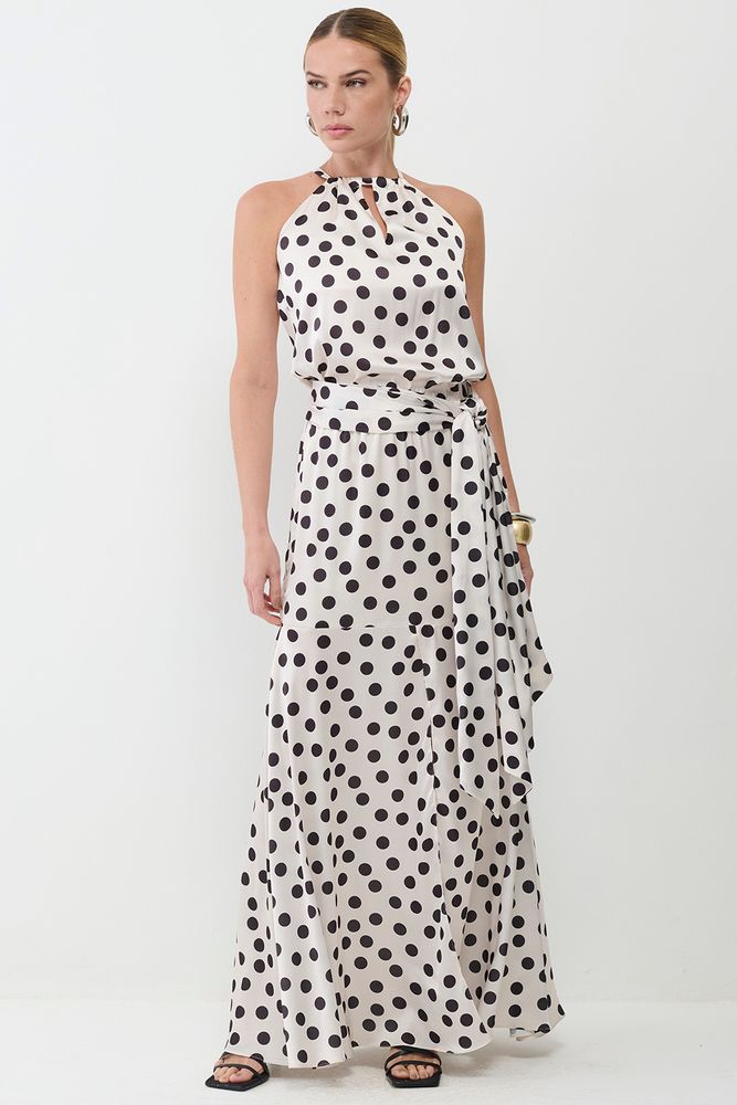 O modelo apresenta decote halter com abertura frontal sutil, proporcionando um toque moderno e delicado. A cintura é destacada por uma faixa ampla que permite diferentes formas de amarração, valorizando a silhueta. A saia longa possui movimento leve e caimento impecável, garantindo conforto e charme em cada passo.