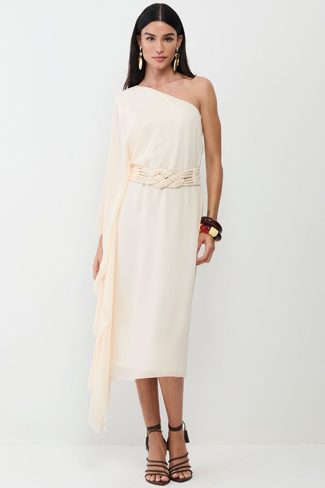 Vestido Midi Ombro Único Com Cinto SMK Off White
